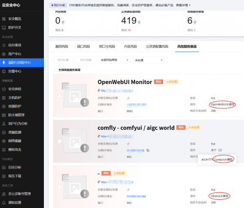 •测绘结果查看:在漏洞与风险中心-风险服务暴露页面查看大模型应用等对外暴露的风险服务。