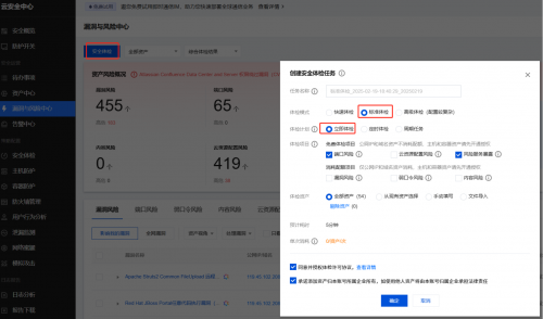 •启动体检任务:在资产中心—点击资产更新后,选择漏洞与风险中心—安全体检—标准体检,选择全部资产。